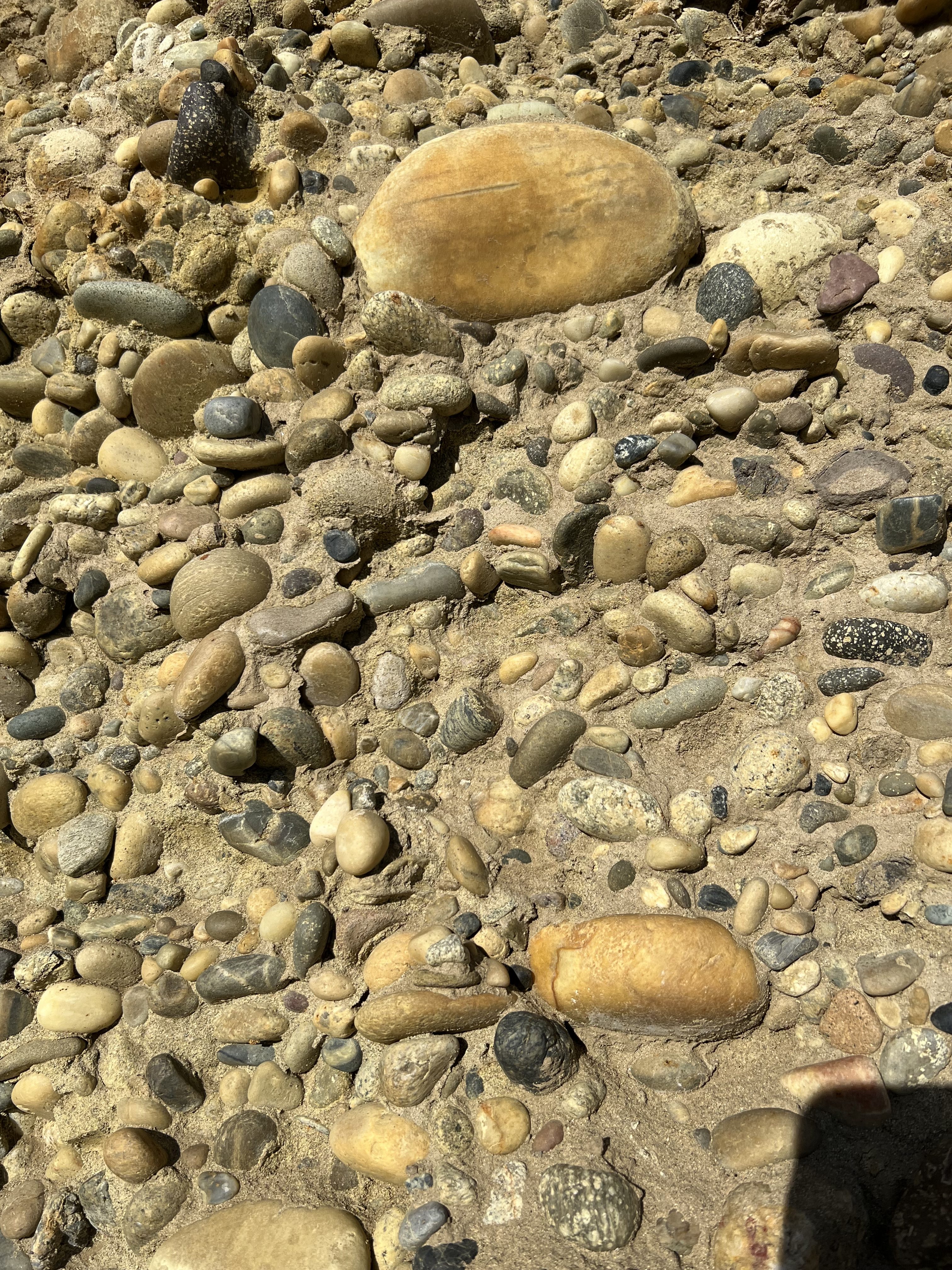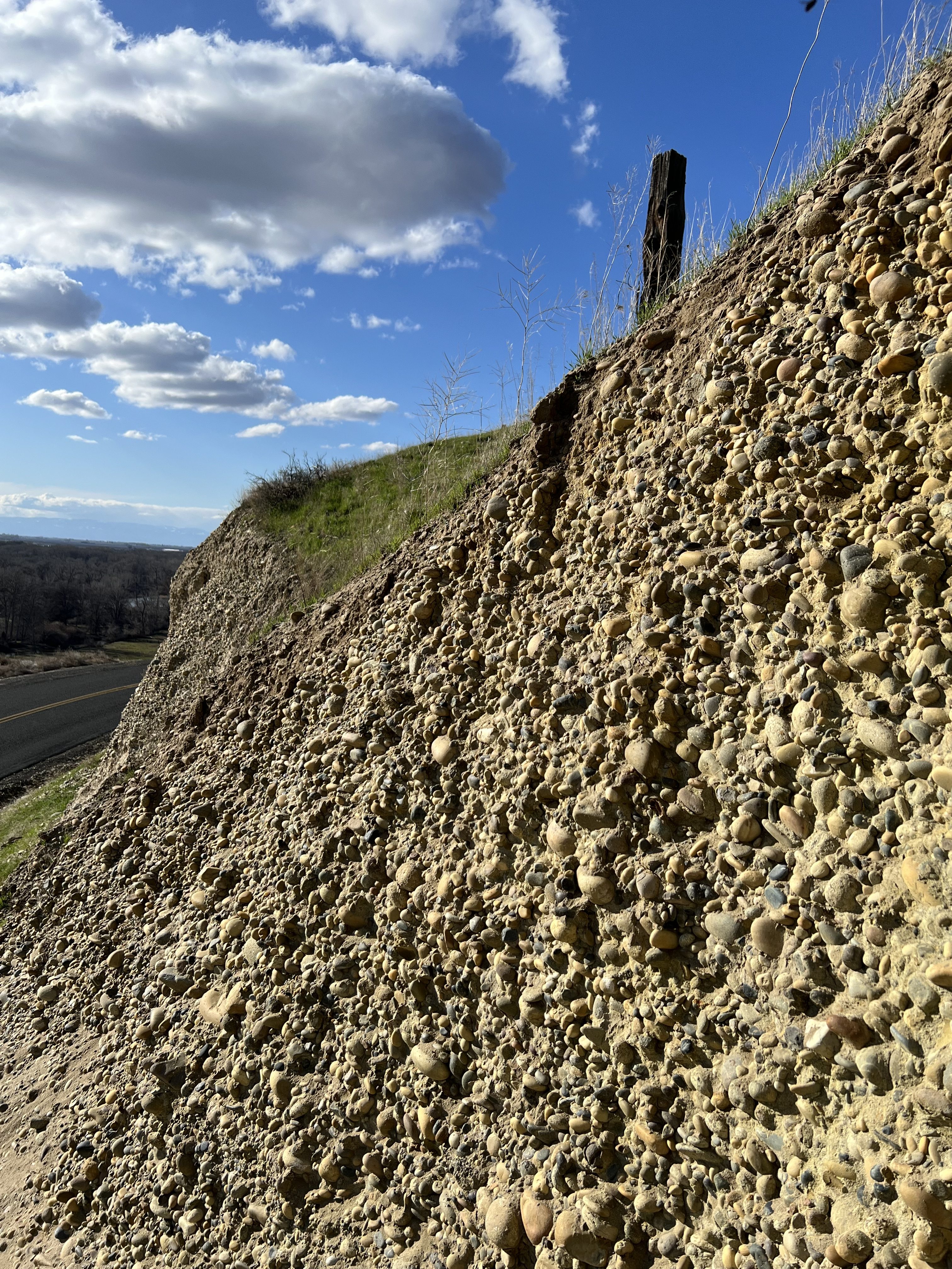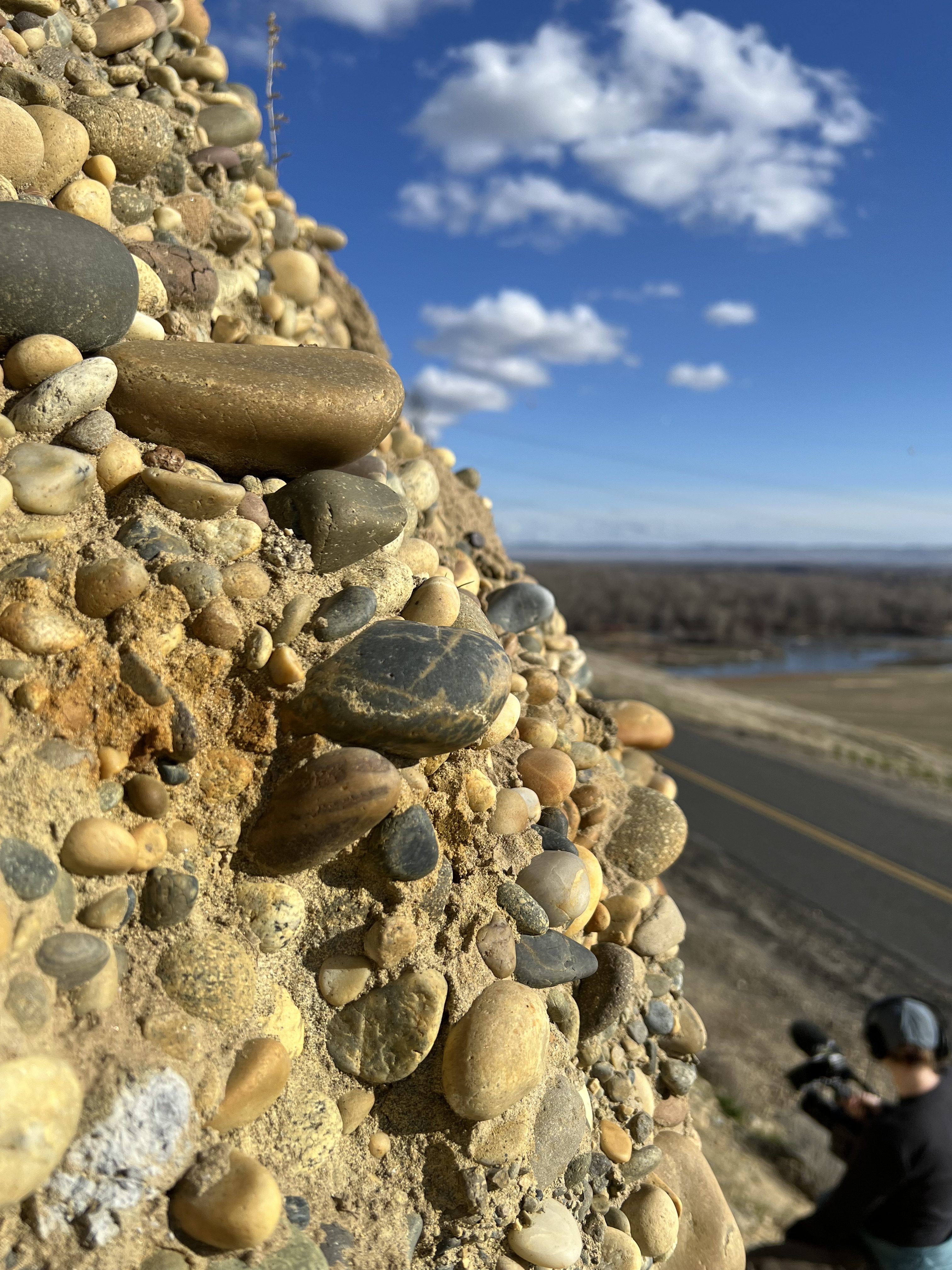 Nick Zentner, geology professor at Central Washington University, describes the geology of the Columbia River Basin at a roadside cut near Granger, Washington. Photo by Fiona Martin.Close-up of 10-million-year-old river cobbles transported by the ancient Columbia River. Today, the Columbia River is about 15 miles away from this site. (The Yakima River is visible in the background.) Photo by Fiona Martin.Another close-up of ancient river cobbles embedded in the roadside cut. Photo by Fiona Martin.The river cobbles are stacked 10–20 feet high in some locations. Photo by Fiona Martin.